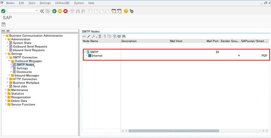 SAP GUIでトランザクションコード SCOT を入力して実行します。 「SAPconnect 管理」画面が表示されます。 メニューバーから [設定] → [SMTP 接続]→ [Outbound Messages]→ [SMTP Nodes] をクリックします。